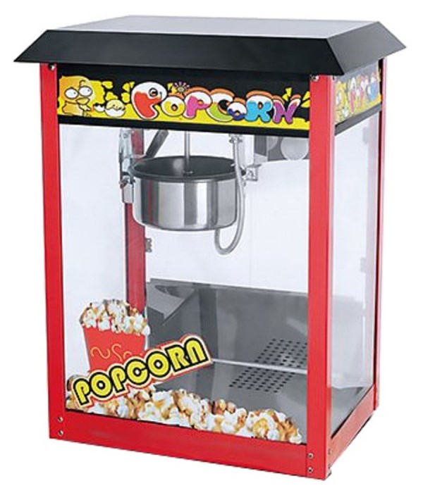 Попкорн аппарат настольный, без тележки, имеет антипригарный котёл, боковые панели из закалённого стекла, инфракрасный подогрев лампой. Объём котла - 8 унций. Производительность - до 4,48 кг/ч (160 порций по 28 г). Разовая загрузка - 224 г. Верх аппарата с рекламной вывеской, боковые стойки - красные.