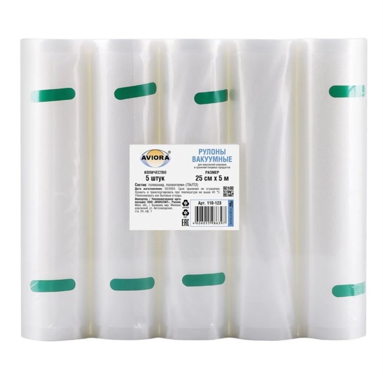 Рулоны вакуумные AVIORA, 250 х 5000 мм, 5 шт/уп. Рулон представляет собой рукав длиной 5 метров, запаянный по бокам