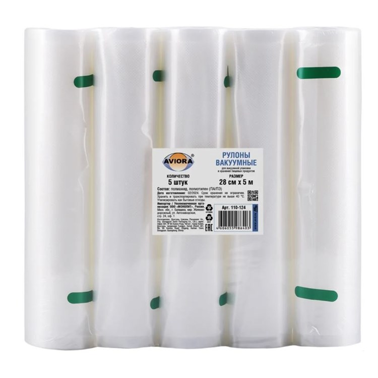Рулоны вакуумные AVIORA, 280 х 5000 мм, 5 шт/уп. Рулон представляет собой рукав длиной 5 метров, запаянный по бокам